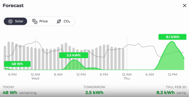 Clicking on this number or the new Forecast menu item takes you to a new view that visualizes the expected PV production for the next 48 hours.